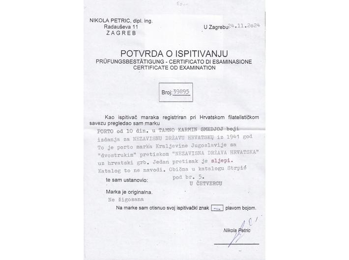 Opis: Porto Michel br. 5, četverac 10 din dvostruki otisak od kojeg je jedan slijepi. Fotoatest Petric, odlična kvaliteta, rijetko.