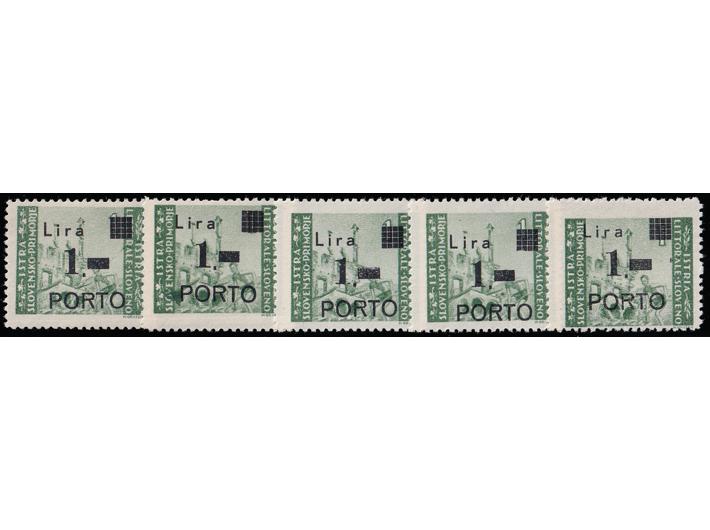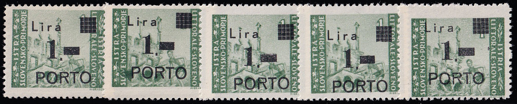 Opis: Porto PS br 8, pet maraka 1 lira s pogreškama tiska. Sve opisano prema Novakoviću D08W-43.1.2, D08W-44.1.2, D08W-53.1.2, D08W-64.1.2 i D08W-69.1.2. Jedna marka sa blagim tragom falca.