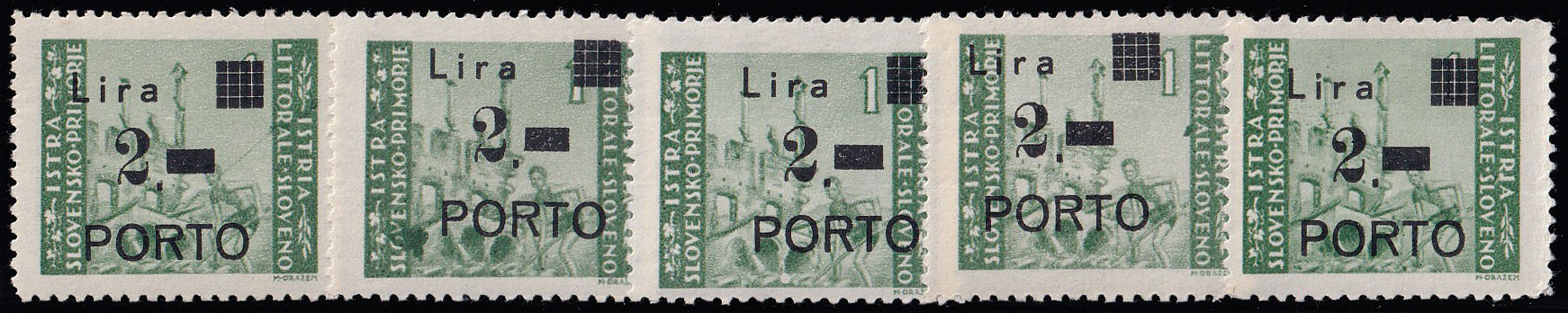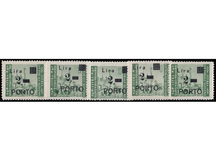 Opis: Porto PS br. 9, pet maraka 2 lire s pogreškama tiska. Sve opisano prema Novakoviću D09W-43.1.2, D09w-44.1.2, D09W-53.1.2, D09W-69.1.2 i D09W-85.1.2. Jedna marka na laganom falcu, ostale sve u odličnoj kvaliteti.