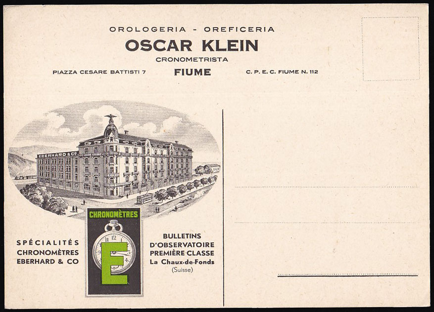 Poslovna dopisnica urara Oscara Kleina iz Rijeke.