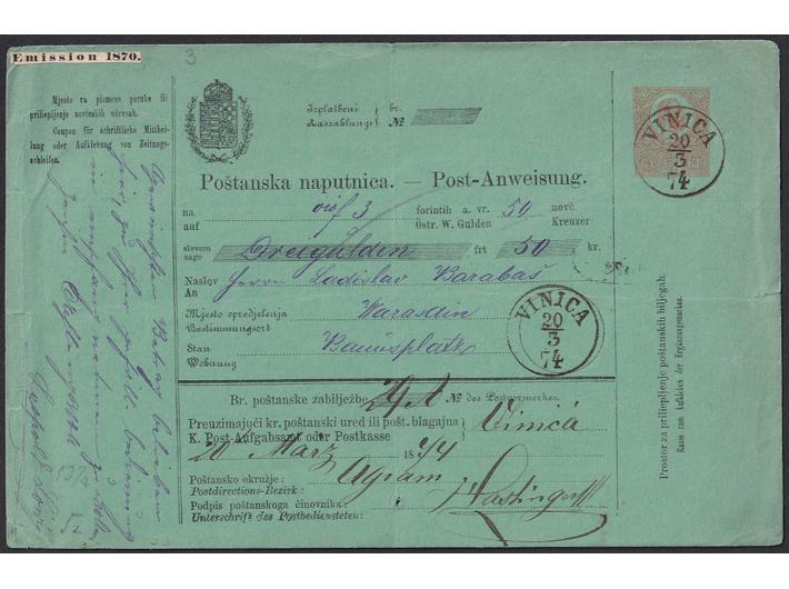 Opis: Poštanska doznačnica za novčani iznos upućen iz Vinice u Varaždin 20.03. 1874. Lijepi žigovi pošte Vinica, dolaz na poleđini. Trag okomitog savijanja.