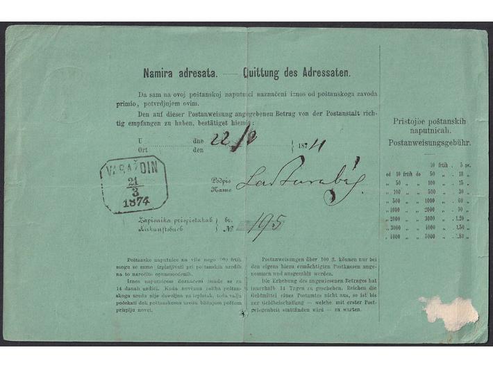 • Poštanska doznačnica za novčani iznos upućen iz Vinice u Varaždin 20.03. 1874.