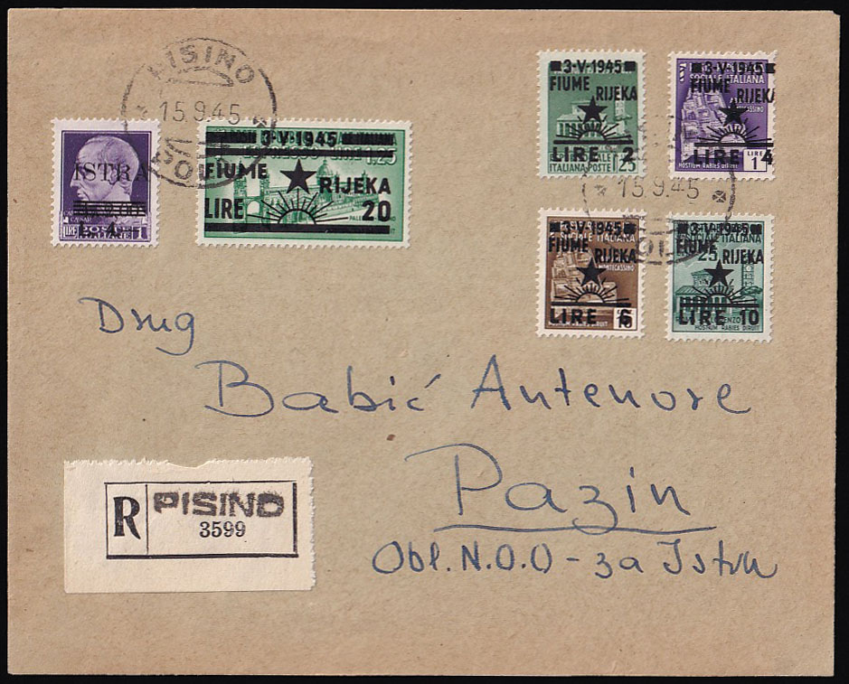 - Preporučeno filatelistički inspirirano pismo upućeno loko Pazin 15.09. 1945.