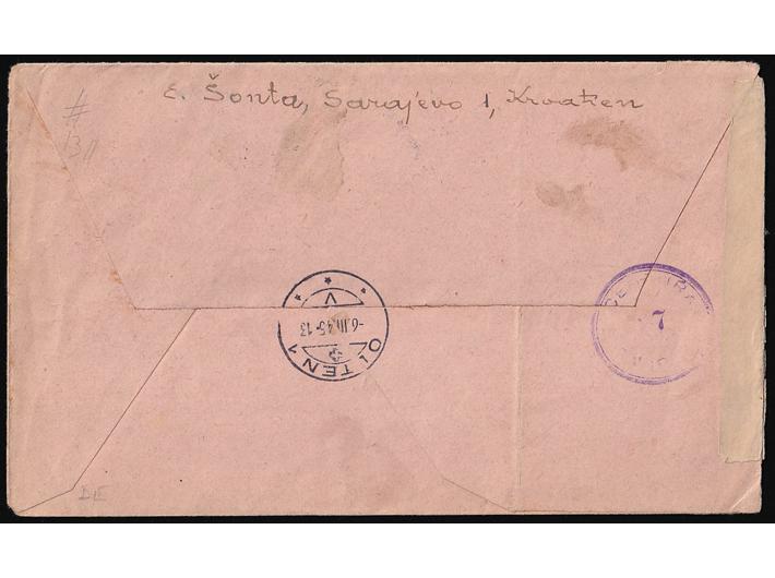 • Preporučeno i zrakoplovom upućeno pismo iz Sarajeva u Olten u Švicarskoj 16.02. 1945.