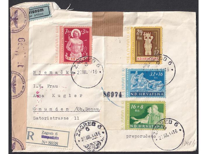 Opis: Preporučeno i zrakoplovom upućeno pismo iz Zagreba u Gmunden 27.3. 1944. Frankirano kompletnim nizom Michel br. 154-157. Cenzurirano po OKW cenzuri. Gornji rub oštećen, trag okomitog savijanja.