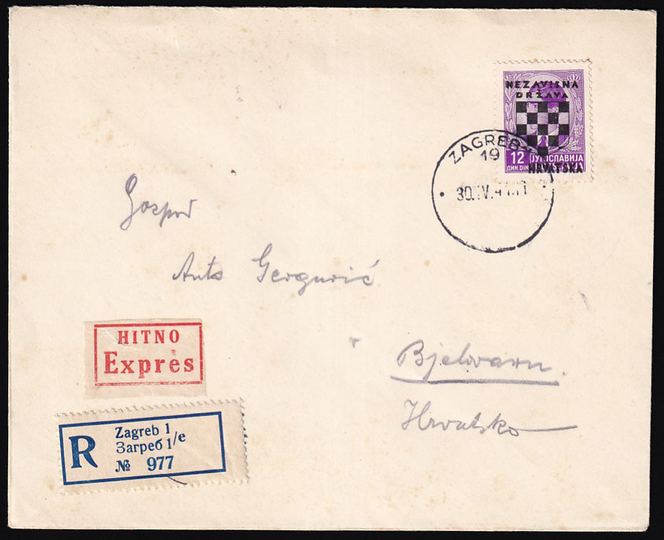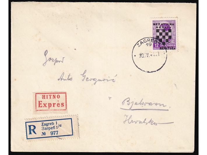 Opis: Preporučeno i žurno pismo upućeno iz Zagreba u Bjelovar 30.04. 1941. Točno frankirano markom od 12 din. (2 din. međumjesni promet, 5 din. preporuka i 5 din. žurno). Manja žuta mrlja na desnom rubu marke.
