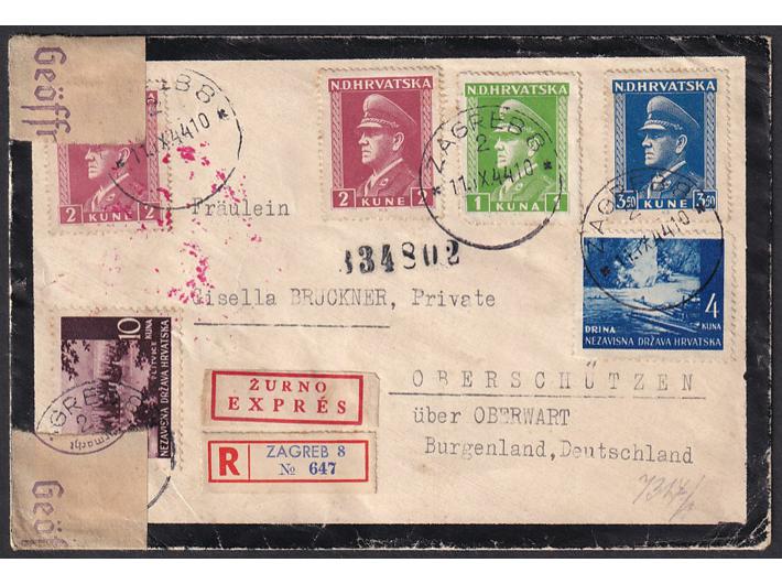Opis: Preporučeno i žurno pismo upućeno iz Zagreba u Njemačku 11.9. 1944. Višebojna frankatura dvaju izdanja (3.50 pismo, (umjesto 4 kn. povlaštena tarifa za Njemačku) 9 kn. preporuka i 10 kn. žurno). Cenzurirano po OKW cenzuri. Dolaz na poleđini. Dobra kvaliteta.