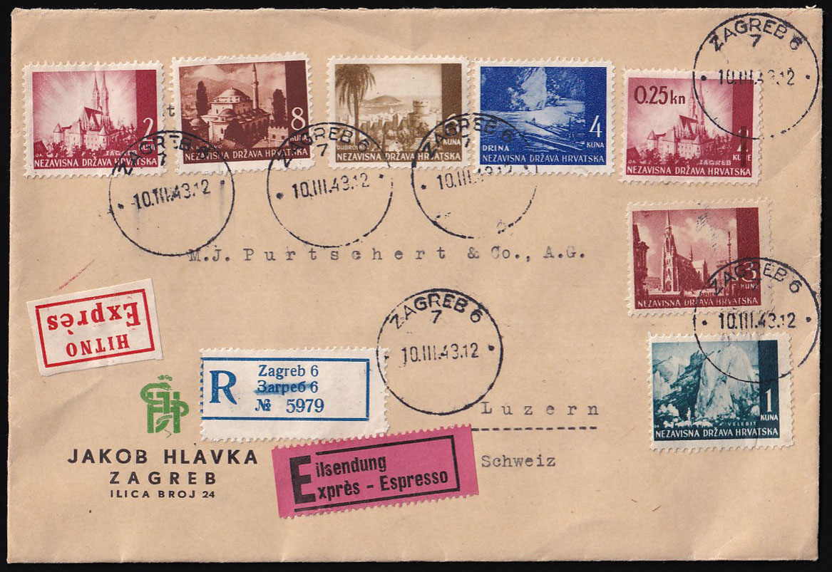 Opis: Preporučeno i žurno pismo upućeno iz Zagreba u Švicarsku 10.03. 1943. Vrlo atraktivno frankirano sedmerobojnom frankaturom maraka krajobrazi u gotovo točnom iznosu. (5 kn. pismo, 9 kn. preporuka i 10 kn žurno). Dolaz na poleđini. Odlična kvaliteta.