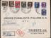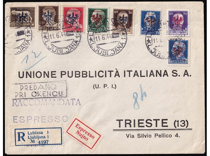 Opis: Preporučeno i žurno upućeno pismo iz Ljubljane u Trst 11.06. 1944. Vrlo atraktivo frankirao nizom od 8 raznih provizornih maraka Njemačke okupacije Slovenije. Dobra kvaliteta.