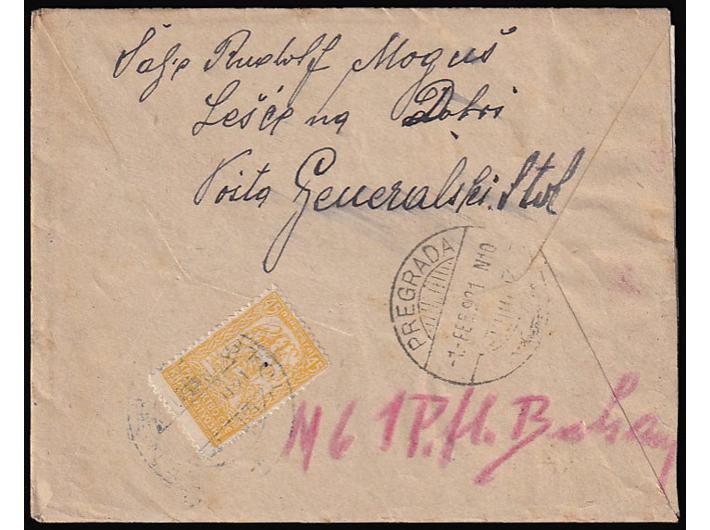 - Preporučeno pismo malog formata pisano u Lešću na Dobri 27.01. 1921 i upućeno iz Generalskog Stola u Pregradu.