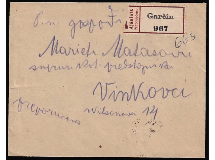 - Preporučeno pismo manjeg formata upućeno iz Garčina u Vinkovce 21.06. 1920.