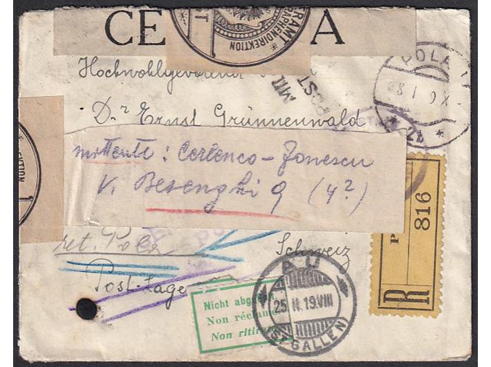 - Preporučeno pismo manjeg formata upućeno iz Pule u Švicarsku 08.01. 1919.