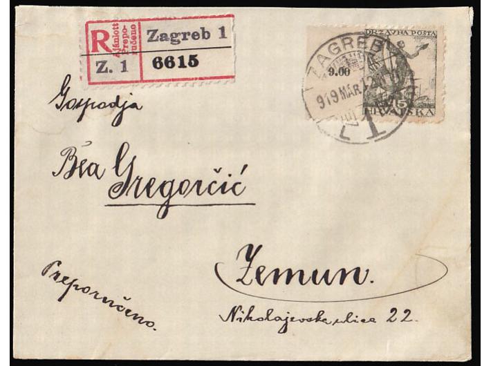 Preporučeno pismo manjeg formata upućeno iz Zagreba u Zemun 12.03. 1919.