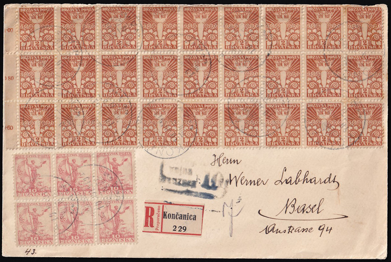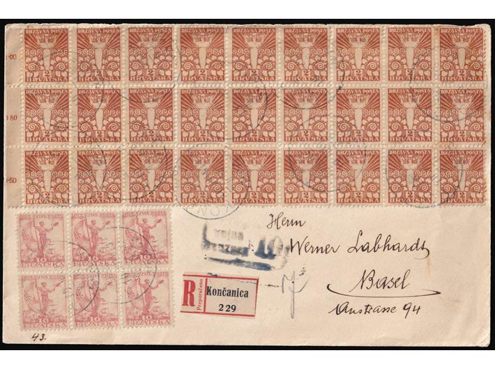 Preporučeno pismo masovno frankirano markom 2 fillira i upućeno iz Končanice u Basel (Švicarska) 10.07. 1919.