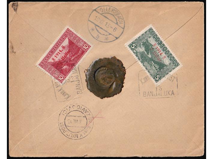 Opis: Preporučeno pismo upućeno iz Banja Luke u Zavidović 27.06. 1915. Preadresirano u Ollersbach. Frankirano parom 10 hellera u paru tip pretiska II dok je na poleđini frankirano markom s tipom pretiska I ( 10 hell) i marka 5 hellera tip pretiska III. Sve opisano u Austria Netto katalogu. Zavidović i dolaz Ollersbach na poleđini. Pismo je iz poznate korespondencije Norbert vitez von Jedina. Odlična kvaliteta.