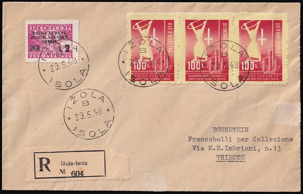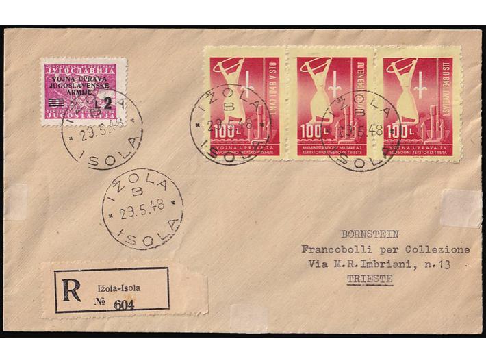 Opis: Preporučeno pismo upućeno iz Izole u Trst 29.05. 1948. Zanimljiva filatelistički inspirirana frankatura s triptihom i markom 2 lire. Dobra kvaliteta.
