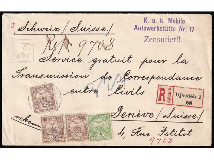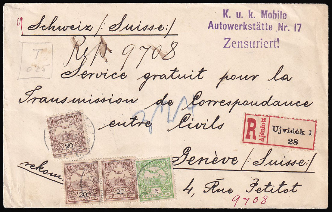 Opis: Preporučeno pismo upućeno iz Novog Sada od mobilne automehaničarske radione austrijske vojske u Švicarsku 07.03. 1915. Tranzit i dolaz na poleđini. Vrlo atraktivno, dvobojno frankirano s tragovima cenzure na lijevom rubu pisma.