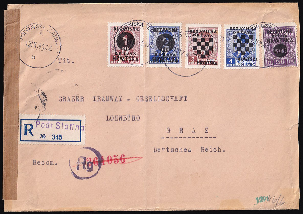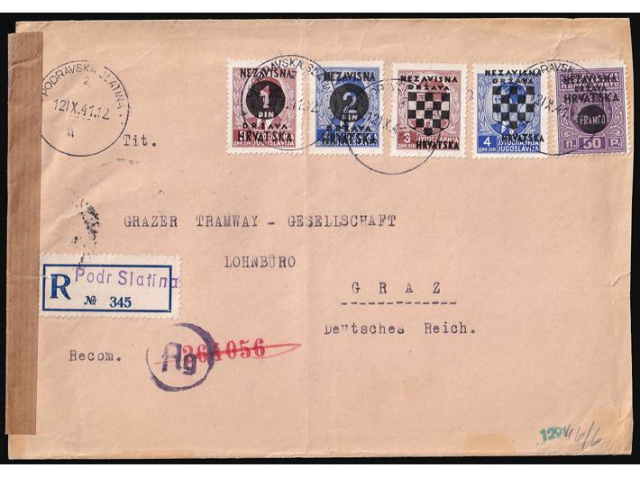 Opis: Preporučeno pismo upućeno iz Podravske Slatine u Graz 12.09. 1941. Cenzurirano po OKW cenzuri. Zanimljiva frankatura triju raznih provizornih izdanja. Trag okomitog savijanja. Dolaz na poleđini.