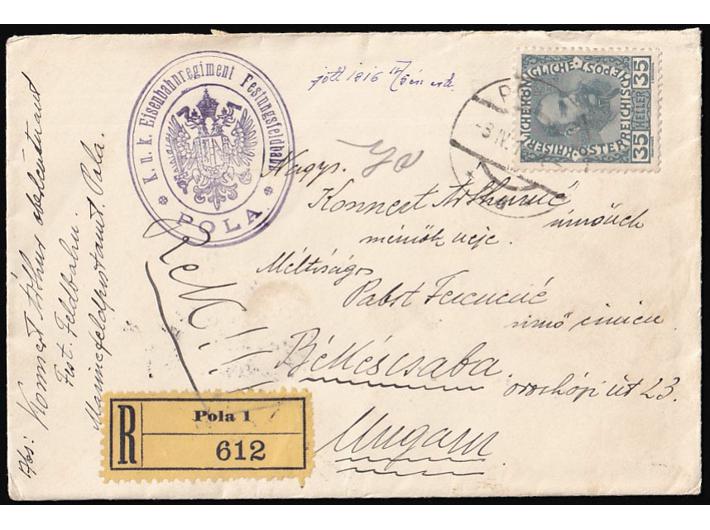 - Preporučeno pismo upućeno iz Pule u Mađarsku 03.04. 1916.
