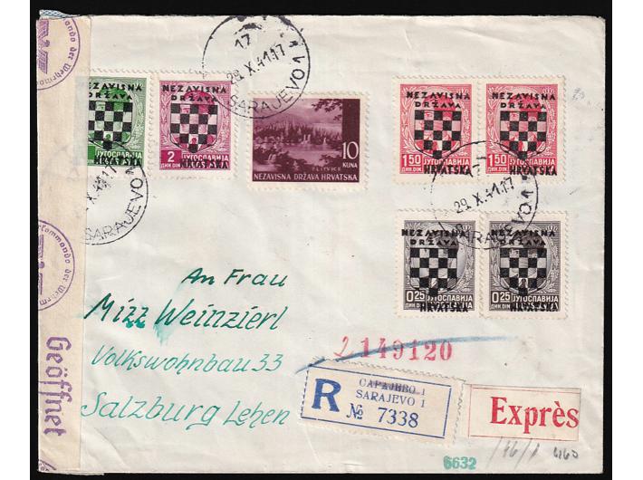 Opis: Preporučeno pismo upućeno iz Sarajeva u Salzburg 29.10. 1941. Cenzurirano po OKW cenzuri. Vrlo atraktivna višebojna frankatura provizornih maraka od koje par 1,50 din. ima pogrešku pretiska, retuš kružnice. Dolaz na poleđini.