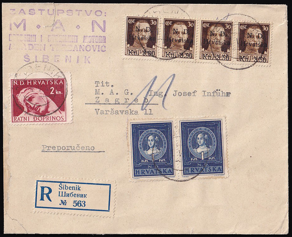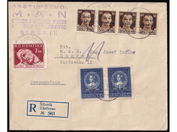 Opis: Preporučeno pismo upućeno iz Šibenika u Zagreb 01.05. 1944. Frankirano provizornim markama Šibenskog lokalnog izdanja (14 kn) i dvije marke po 1 kn iz niza Zaslužni Hrvati što je točna frankatura za pismo II stope težine (21-250 grama). Lijevi rub pisma repariran. Dolaz na poleđini.