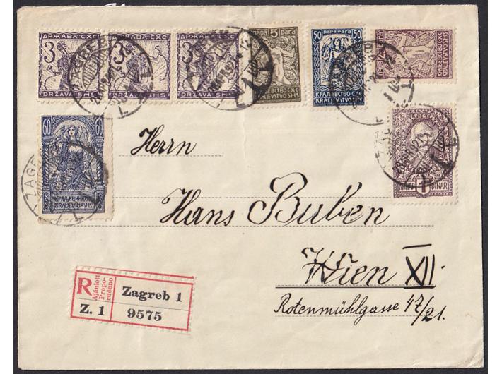 Opis: Preporučeno pismo upućeno iz Zagreba u Beč 28.04. 1921. Vrlo atraktivna masovna frankatura. Odlična kvaliteta.