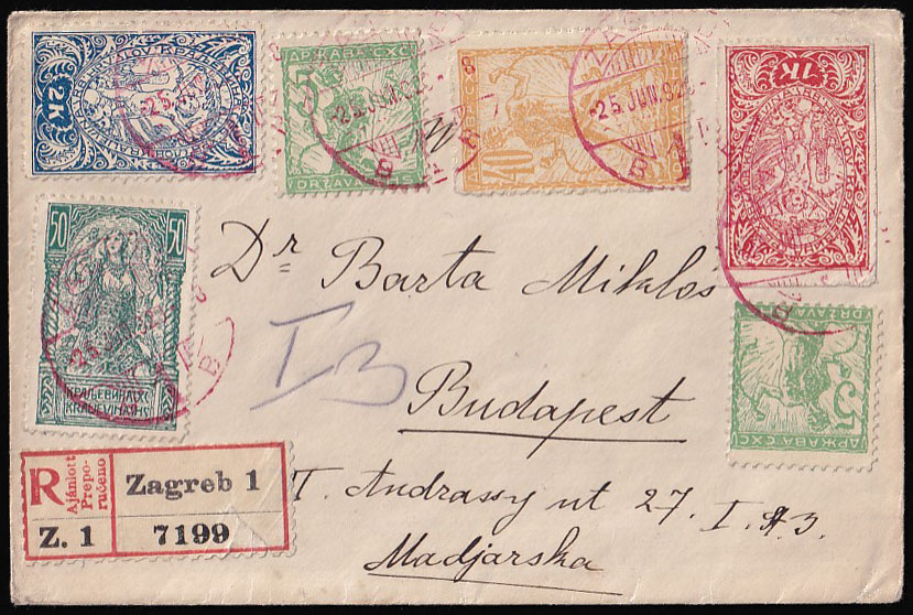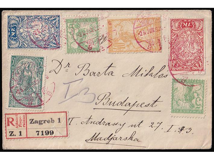 Opis: Preporučeno pismo upućeno iz Zagreba u Budimpeštu 25.07. 1920. Vrlo atraktivna višebojna frankatura poništena crvenim žigom pošte Zagreb. Dolaz na poleđini. Dobra kvaliteta.
