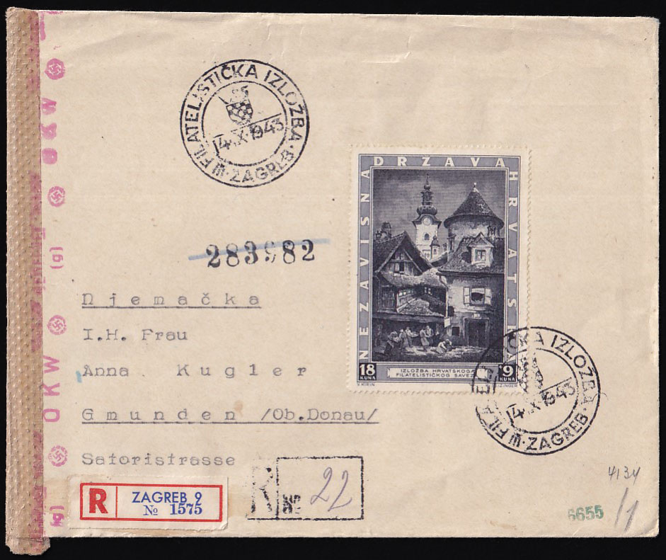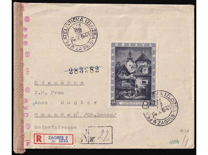 Opis: Preporučeno pismo upućeno iz Zagreba u Gmunden 14.10. 1943. Frankirano markom Michel br. 115 i poništeno dnevnim prigodnim žigom izložbe gdje je dobio i provizorni R žig. Kasnije upućeno preko pošte Zagreb 2 na odredište kada dobiva i R naljepnicu. Cenzurirano po OKW cenzuri. Dolaz na poleđini. Dobra kvaliteta, rijetko.