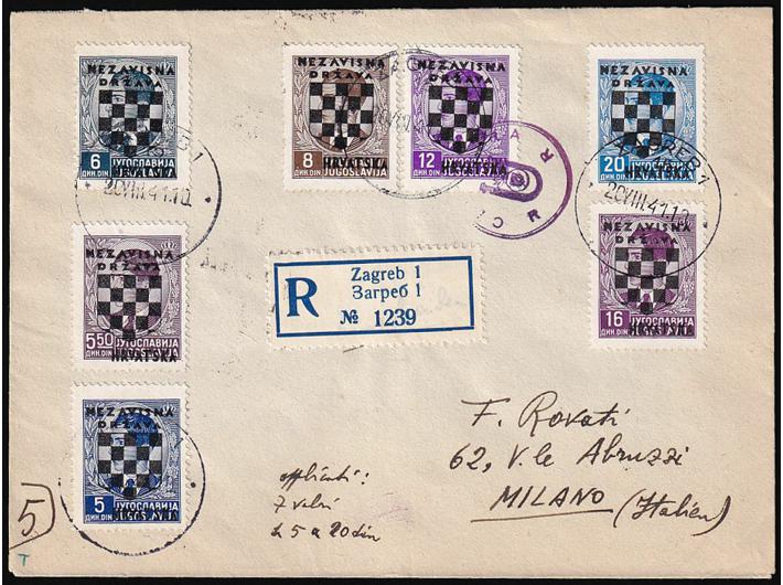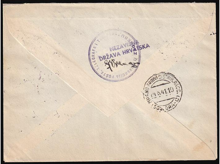 Opis: Preporučeno pismo upućeno iz Zagreba u Italiju 20.08. 1941. Cenzurirano po R.U.R. cenzuri. Dolaz na poleđini. Filatelistički inspirirana prekomjerna frankatura.