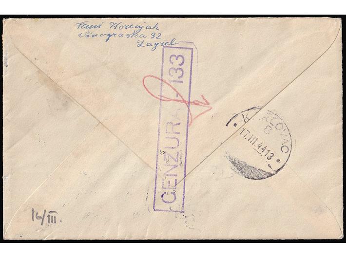 Opis: Preporučeno pismo upućeno iz Zagreba u Karlovac 16.03. 1944. Točna frankatura (3,5 kn. pismo i 9 kn. preporuka + 2 kn. ratni doprinos.). U dolazu cenzurirano što potvrđuje otisak žiga CENZURA – 133. Paraf cenzora crvenom bojom. Opisano u Pervan-Zrinjšćak na str. 113/114. Dolaz na poleđini. Dobra kvaliteta.