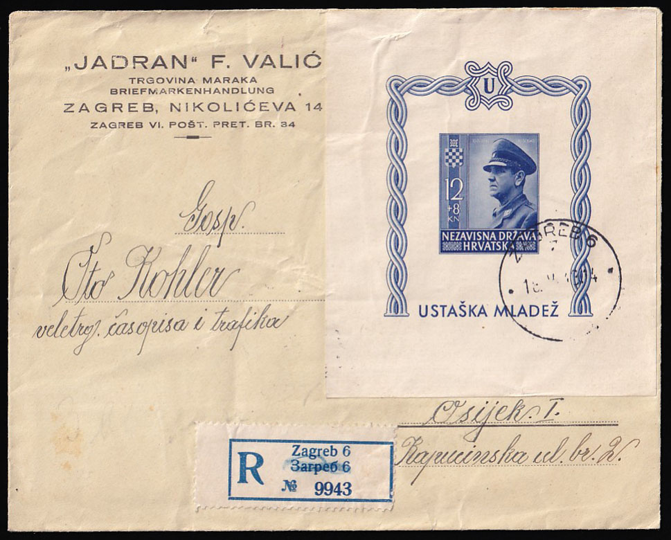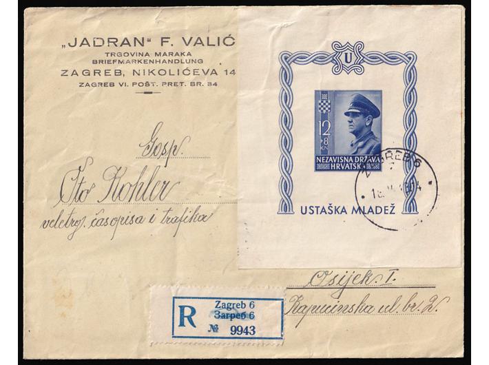 Opis: Preporučeno pismo upućeno iz Zagreba u Osijek 18.05. 1943. Frankirano nezupčanim blokom izdanim povodom 2. godišnjice NDH i Ustaške Mladeži. Izuzetno rijetka frankatura, dolazni žig na poleđini. R naljepnica iz doba kraljevine Jugoslavije. Dobra kvaliteta.