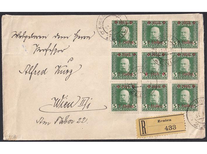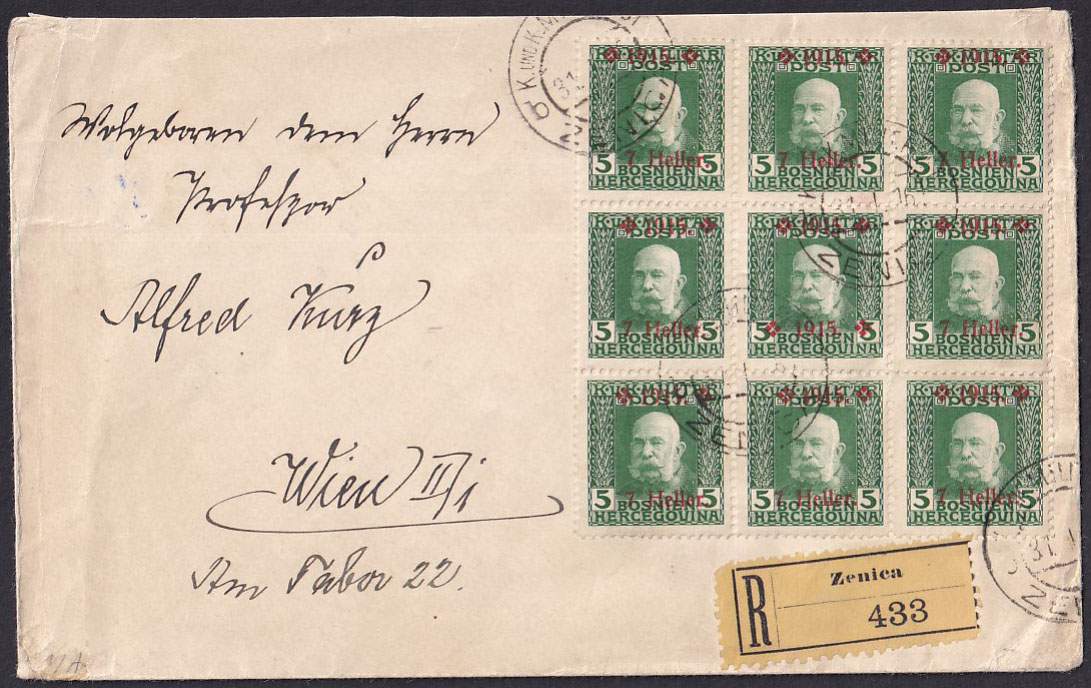 Opis: Preporučeno pismo upućeno iz Zenice u Beč 31.01. 1916. Frankirano devetercem provizornih maraka s pretiskom nove nominale (7 hel) i godinom 1915. Centralna marka deveterca s pogreškom pretiska, otisnuta godina 1915 umjesto nominale. Dobra kvaliteta.