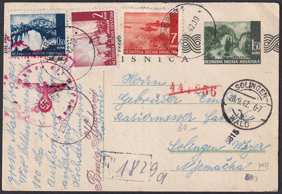 Opis: Preporučeno upućena dopisnica iz Zagreba u Solingen u Njemačkoj 23.09. 1944. Točno višebojno frankirana (dopisnica 2 kn. povlaštena tarifa za Njemačku i 9 kn. preporuka). OKW cenzura, dolazni žig, dobra kvaliteta.