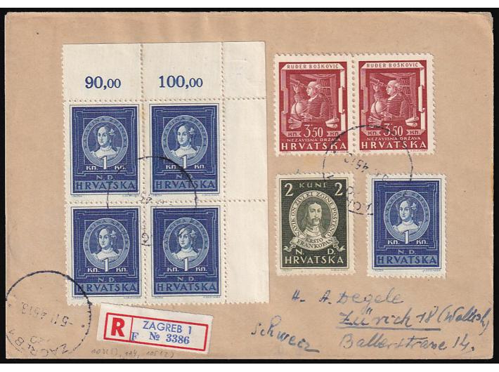 Opis: Preporučeno upućeno pismo iz Zagreba u Švicarsku 05.02. 1945. Točna frankatura (5 kn. pismo i 9 kn preporuka). Dolaz na poleđini. Odlična kvaliteta.