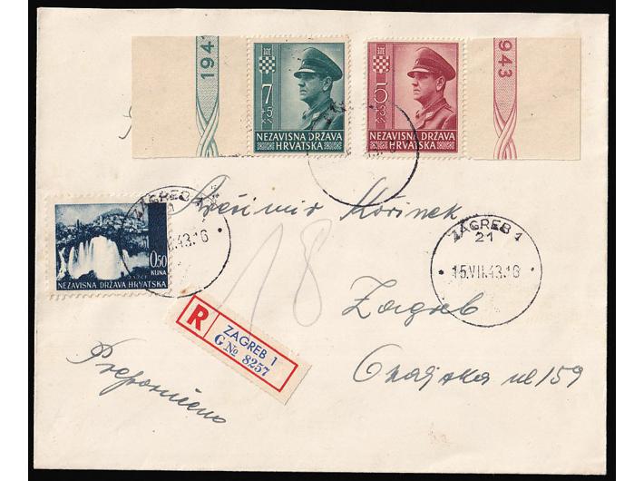 Opis: Preporučeno upućeno pismo loko Zagreb 15.08. 1943. Točno franikrano prigodnim nizom Michel 100/101 i dofrankirano markom 0,50 iz niza krajobrazi (mjesni promet 3,50 kn. i preporuka 9 kn.). Cenzurirano po zagrebačkoj cenzuri, dolaz na poleđini. Dobra kvaliteta.