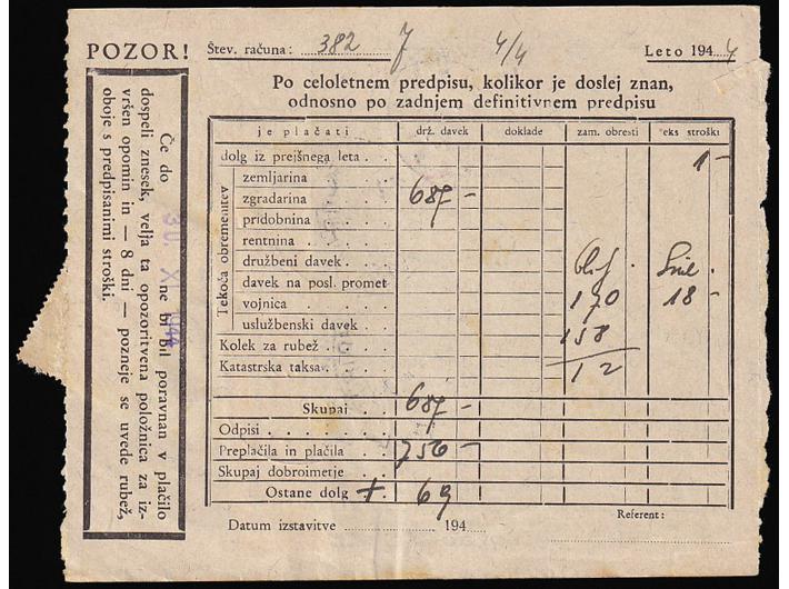 Opis: Priznanica za novčanu uplatu mješovito frankirana talijanskim provizornim biljezima za Ljubljanu i provizornim porto marka Njemačke okupacije 30. 11 1944. Dobra kvaliteta.