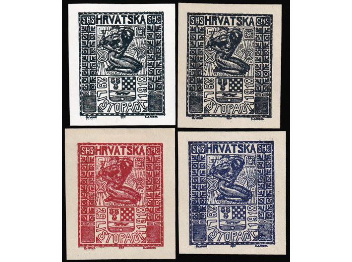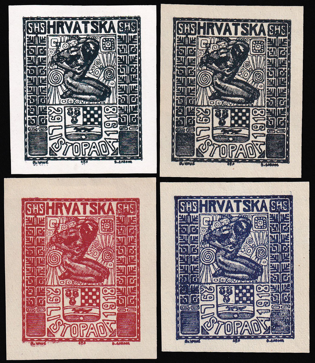 Opis: Probni otisci u velikom formatu niza 29. listopad. Jedna proba (siva) na papiru za umjetnički tisak, a ostale na smeđe-žutom papiru. Opisano u HFS priručniku br. 2 na str. 132. Veličina slike 33 mm x 40 mm. Odlična kvaliteta.
