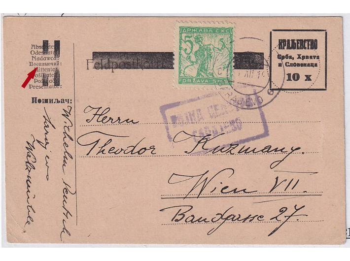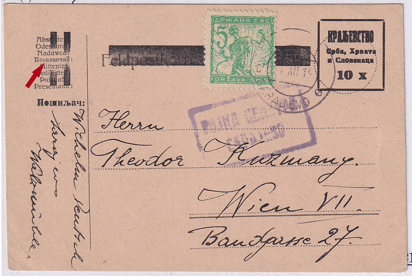 - Provizorna dopisnica dofrankirana i upućena iz Sarajeva u Beč 01.12. 1919.