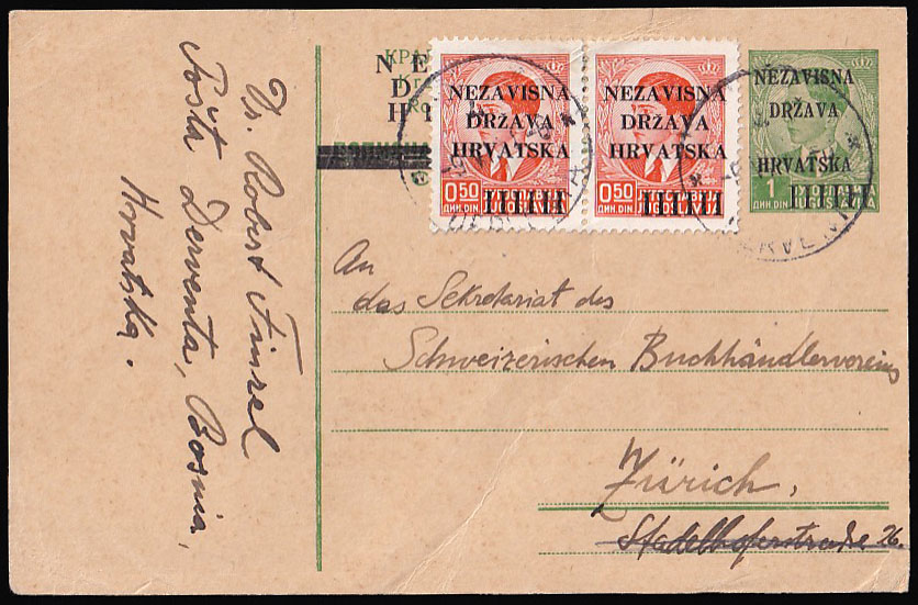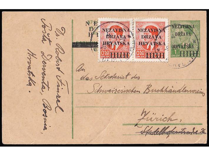 • Provizorna dopisnica dofrankirana prvim markama NDH i upućena iz Dervente u Švicarsku 09.05. 1941.