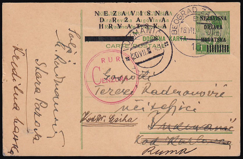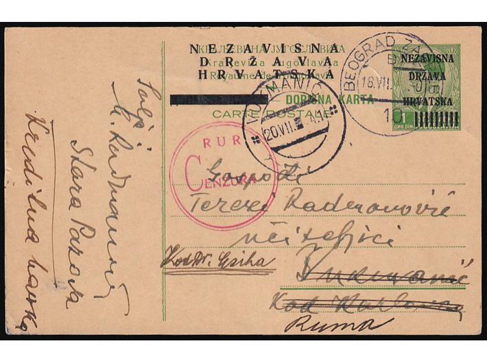 Opis: Provizorna dopisnica s 9 štapića pisana u Staroj Pazovi i predana na prugu BEOGRAD-ZAGREB 10 upućena u Vukmanić kod Karlovca 18.07. 1941. Dolazni žig Vukmanić 20.07. cenzurirana po cenzuri Karlovac (Pervan-Zrinjšćak str. 39). Preadresiran za Rumu. Odlična kvaliteta.