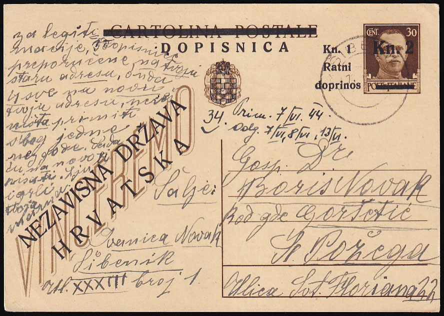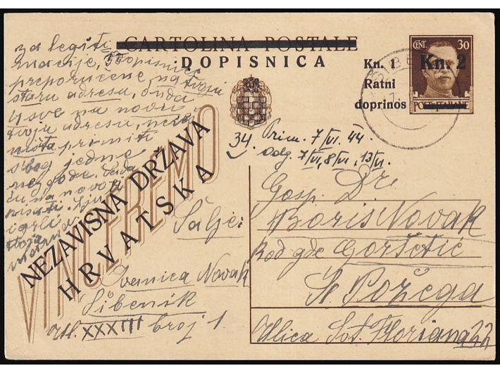 Opis: Provizorna dopisnica za Šibenik upućena iz Šibenika u Požegu 18.05. 1944. Potječe iz poznate Novak korespondencije. Odlična kvaliteta, rijetko. Garancija aukcije.
