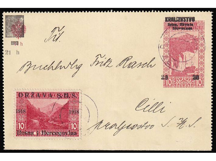 Opis: Provizorna zatvorena dopisnica dofrankirana i upućena iz Zenice u Celje 09.09. 1919. Dobra kvaliteta.