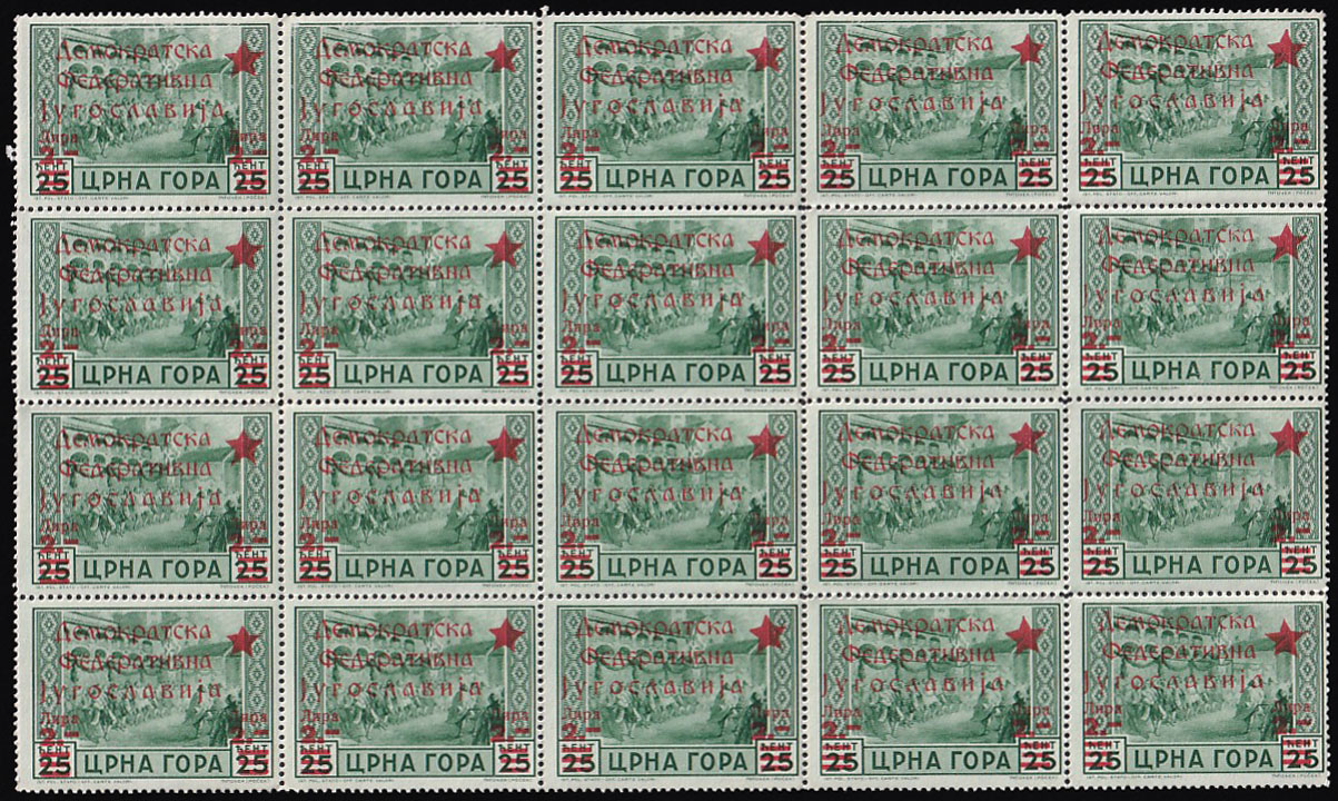 Opis: Provizorno izdanje za Cetinje 2 lire na 25 centi, pretisni arčić 5x4 s pogreškom pretiska 2. Polja DEMOKRATSKD umjesto DEMOKRATSKA. Odlična kvaliteta.
