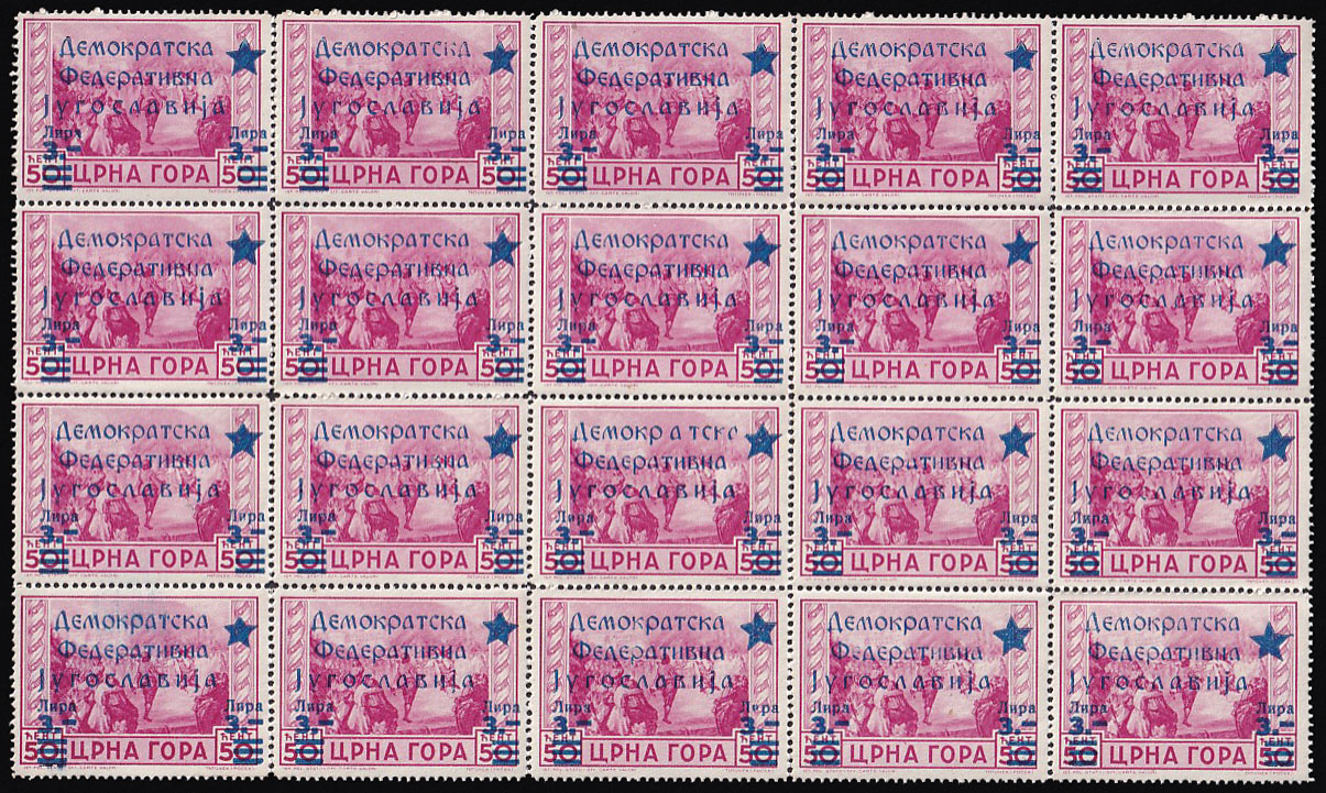 Opis: Provizorno izdanje za Cetinje 3 lire na 50 centi, pretisni arčić 5x4 s pogreškama pretiska 2. polja DEMOKRATSKD umjesto DEMOKRATSKA i pogreška 13 polja A s razmakom u riječi DEMOKRATSKA. Odlična kvaliteta.