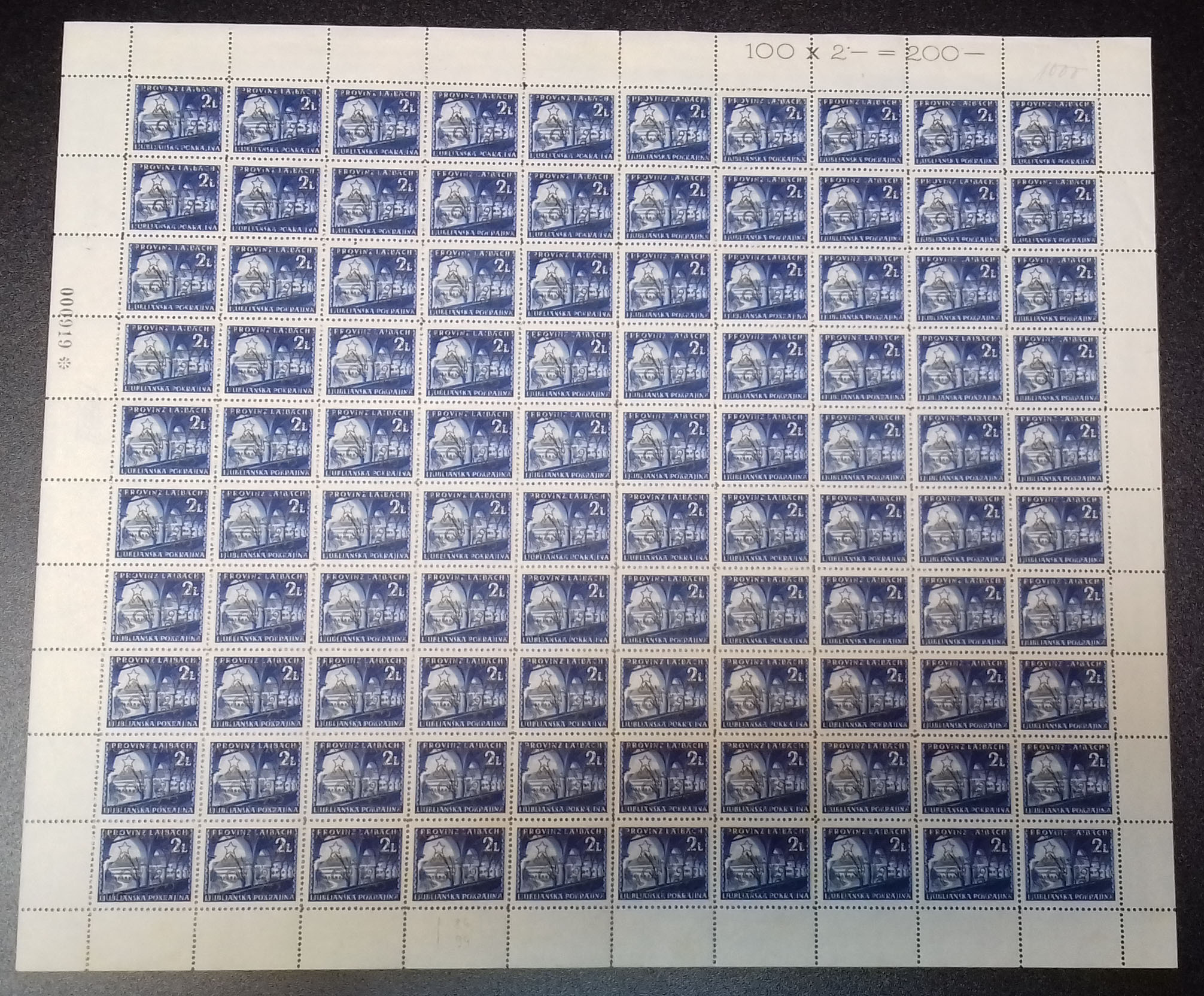 Opis: Provizorno izdanje za Ljubljanu 2 lire, Michel br. 10, kompletan arak. Više žutih mrlja na poleđini.