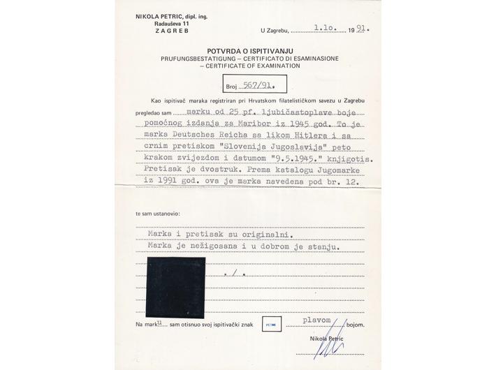 Opis: Provizorno izdanje za Maribor, 25 pf. Dvostruki pretisak. Fotoatest Petric. Odlična kvaliteta.