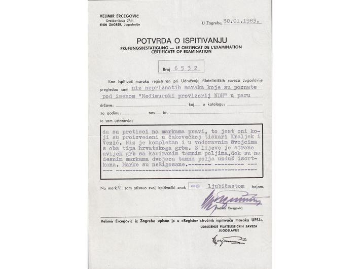 Opis: Provizorno izdanje za Međimurje, kompletan niz u parovima I i II tip pretiska. Vrlo rijetko u kompletu. Izuzetno dobra kvaliteta za ovo izdanje, atest Ercegović.