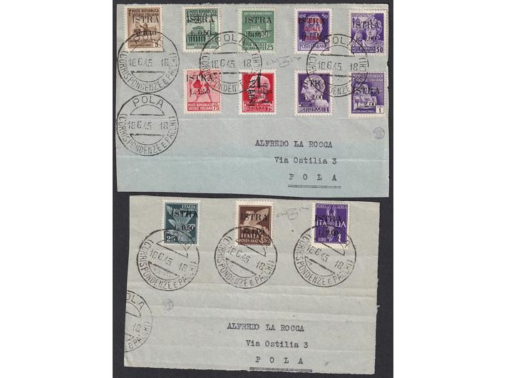 • Provizorno izdanje za Pulu „Fratelli Bandiera“ kompletna serija na tri isječka putovalih koverata poništene žigom POLA 18.06. 1945.