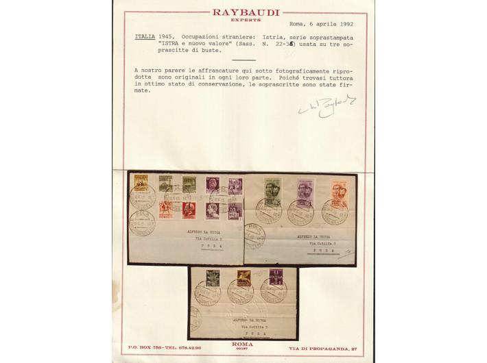 Opis: Provizorno izdanje za Pulu „Fratelli Bandiera“ kompletna serija na tri isječka putovalih koverata poništene žigom POLA 18.06. 1945. Fotoatest Baybaudi. Dobra kvaliteta.