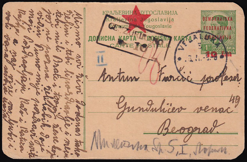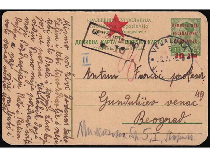 • Provizorno izdanje za Split, dopisnica upućena iz Vele Luke u Beograd 26.06. 1945.